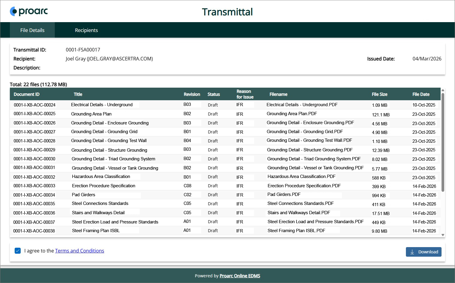Proarc Fileshare Outbound streamlines external distribution of large files and transmittals by issuing secure download links directly from official Proarc document revisions; avoiding the risks, size limits, and lack of proof that sending copies of files using email introduces.